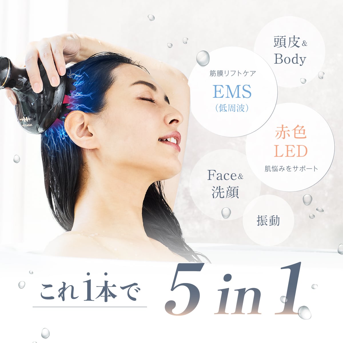 安心の防水仕様で、シャワー時や入浴中でも安心してご使用いただけます。EMSは水を介すと広域に、均等にしっかり刺激が伝わるため、濡れた髪や体でのご使用がおすすめです。